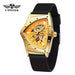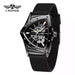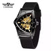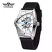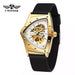 Make a bold statement with the T-Winner Men's Triangle Mechanical Watch, designed for men who love unique style. Its eye-catching triangle-shaped dial with a hollow skeleton display reveals the precise automatic mechanical movement inside, offering both function and fashion. The comfortable silicone strap and sturdy alloy case ensure durability while maintaining a modern, lightweight feel. With a transparent back and mineral reinforced glass mirror, this watch combines style with easy readability. Perfect for casual outings, office wear, or social events, it’s a versatile addition to any wardrobe. Handpicked from Abroad, this watch brings international quality craftsmanship straight to your wrist. Its distinctive design, paired with reliable mechanical performance, makes it an ideal choice for fashion-forward men seeking a statement timepiece.