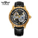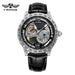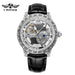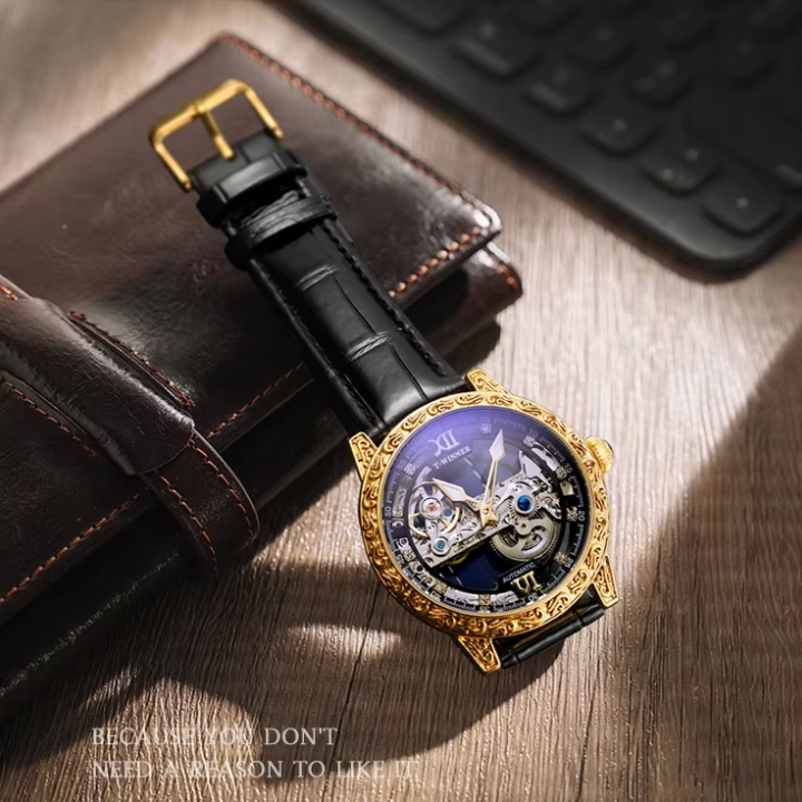Elevate your wristwear with the T-Winner Skeleton Automatic Watch, a perfect blend of elegance and mechanical mastery. This timepiece features a stunning transparent dial that reveals the intricate inner workings of its automatic movement — a true statement of sophistication. The soft leather strap ensures comfort, while the luminous hands provide clear visibility even in low light. Designed in a round alloy case with a detailed skeleton dial, it’s ideal for men who appreciate both style and substance. Whether for business meetings or casual wear, this watch adds a refined edge to any outfit. Handpicked from Abroad, it embodies global craftsmanship and timeless appeal for the modern gentleman.