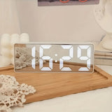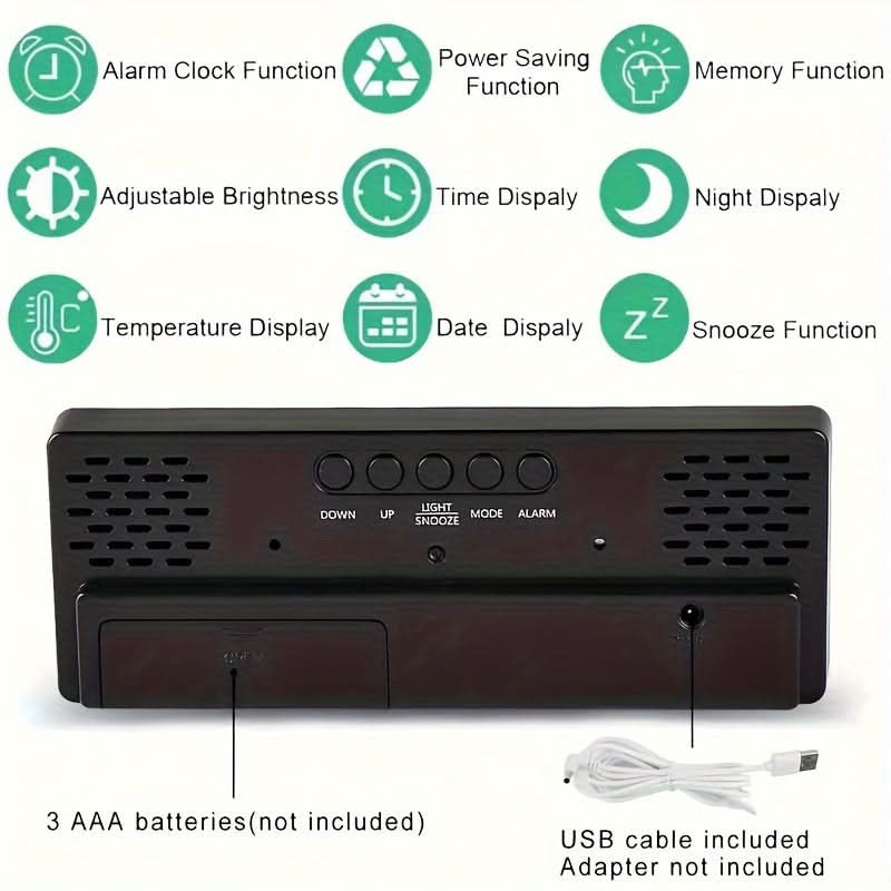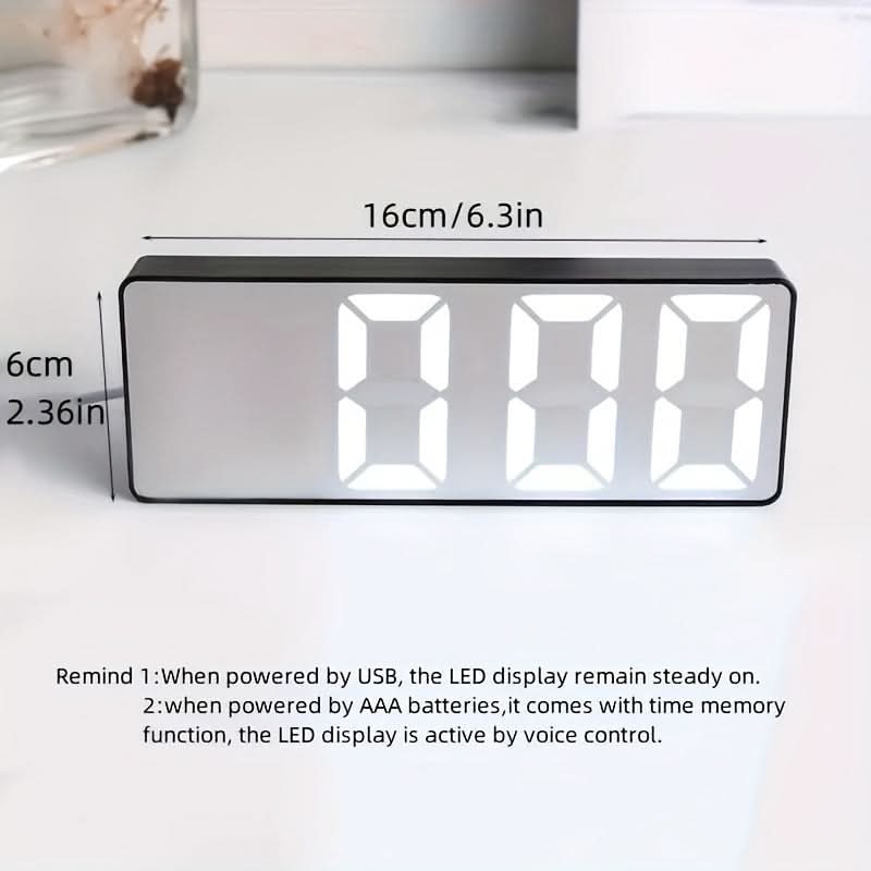 Upgrade your desk or bedroom with this sleek USB-powered LED digital alarm clock, designed for modern living. Featuring a large, easy-to-read LED display, it doubles as a stylish mirror when turned off, adding a contemporary touch to any space. With dual brightness settings and voice control, you can customize it to suit your needs, day or night. The compact, 10mm-thick design ensures it fits perfectly on your nightstand or desk without cluttering your space. Powered via USB, this clock eliminates the need for batteries, making it a convenient and eco-friendly choice. Whether you're setting alarms for work or simply enhancing your home decor, this minimalist clock combines functionality with style. Perfect for bedrooms, offices, and dorm rooms, it’s the ideal blend of practicality and aesthetics.
