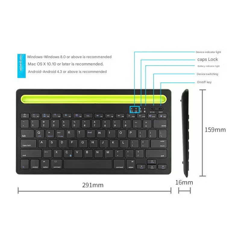 Upgrade your workspace with this sleek wireless Bluetooth keyboard, designed for seamless typing across tablets and smartphones. With dual-mode and dual-channel connectivity, you can easily switch between two devices—perfect for multitasking in the office or at home. Its integrated stand keeps your device upright for comfortable viewing, while the fast-charging feature ensures you're powered up quickly with long standby performance. The compact design (291×159×16mm) fits neatly on your desk, and the waterproof ABS material adds durability without compromising on style.