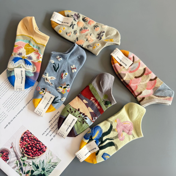 Add a touch of artistry to your wardrobe with these Women’s Cotton Boat Socks, inspired by French light luxury style. Crafted from a premium cotton blend, they’re soft, breathable, and designed for comfort in spring, summer, and autumn. The low-cut, shallow-mouth design makes them ideal for pairing with sneakers, loafers, or casual shoes while staying discreetly stylish. Featuring unique patterns inspired by characters, cosmic skies, plants, and abstract colors, these socks bring a retro yet modern charm to everyday wear. Machine-sewn with precision, they are durable and designed to absorb sweat, keeping your feet fresh all day. Sized EU 36–41, they fit most women comfortably. Handpicked from Abroad, this collection combines artistic elegance with everyday practicality, making these socks perfect for trendsetters who love subtle yet expressive fashion details.