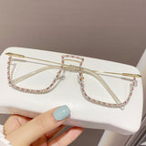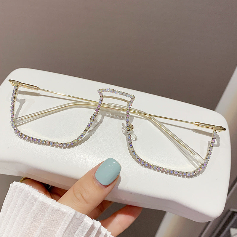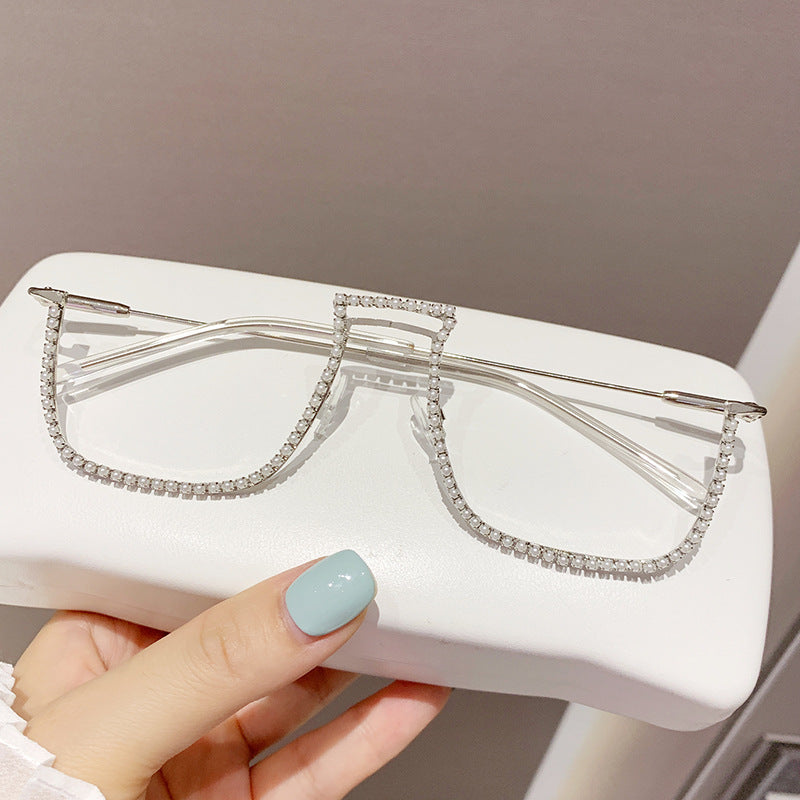 Step into the spotlight with these stunning rhinestone decorative glasses designed for the bold and fashion-forward. Featuring a sleek lower half-frame with shimmering diamond-studded accents, these trendy fashion glasses bring high-glam energy to any look—no lenses needed. Whether you’re headed to a photo shoot, music event, or just want to turn heads on the street, these frames deliver standout style.
