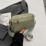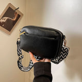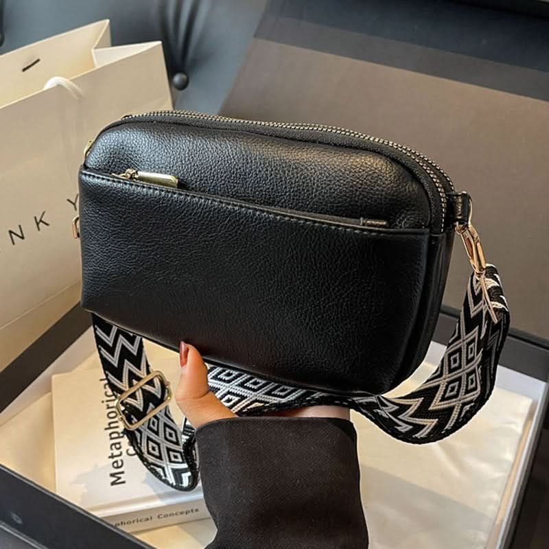 The dual-zippered main compartment offers ample space for essentials like your phone, wallet, and keys, while the front slip pocket provides quick access to smaller items. The wide, adjustable shoulder strap with a stylish geometric pattern ensures comfort and versatility, allowing you to wear it as a shoulder bag or crossbody.